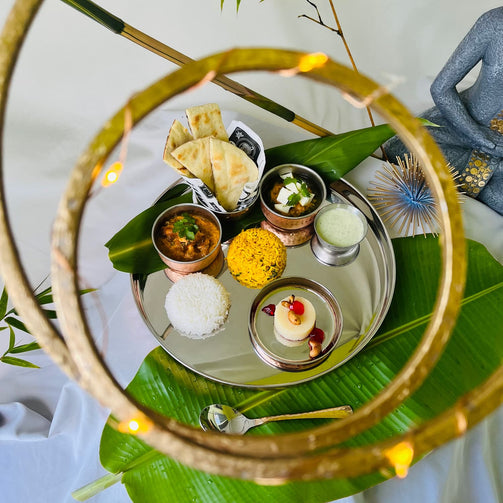 Thali is a complete meal served on a single plate. Characterized by eye-popping variety of two curries, two chutney’s, Naan, Basmati Rice, Biryani Rice, 1 Beverage & a traditional dessert.