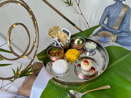 Lamb Curry, Lentil Curry, Basmati Rice, Biryani Rice, Naan, Fruit Chutney, Mango Juice and chocolate bon bon