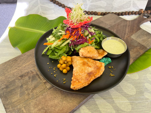 2 Samosa's topped with Garbanzo Bean Curry, fresh local farm grown lettuce, cucumber, cabbage, carrots, tamarind chutney & yogurt mint-cilantro chutney